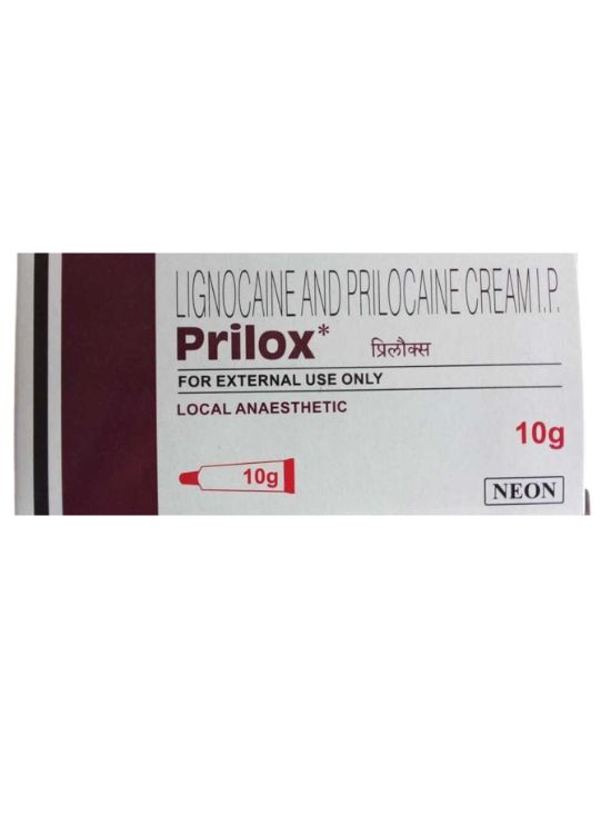 SIZE:- 10 GM MARKETED BY:- NEON SALT COMPOSITION:- LIDOCAINE-2.5%W/W + PRILOCAINE-2.5%W/W USAGE:- Prilox Cream acts as a local anaesthetic, numbing the skin to reduce pain and discomfort during injections or minor surgeries. DOSAGE:- As directed by Physician OR Doctor. STORAGE:- Store in a cool and dry place away from sunlight. CAUTION:- Keep out of reach of children.